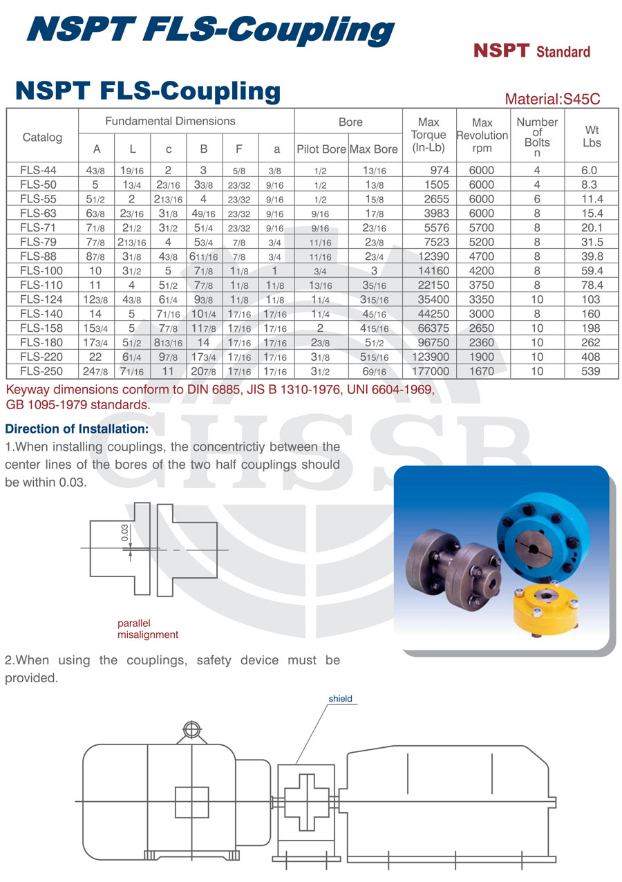 產品范圍: 美標:(FL/FLS) 歐標:(FL/FLS) 英制尺寸產品(適用于美標市場) 公制尺寸產品(適用于歐標市場) FL型聯軸器 FLS型聯軸器